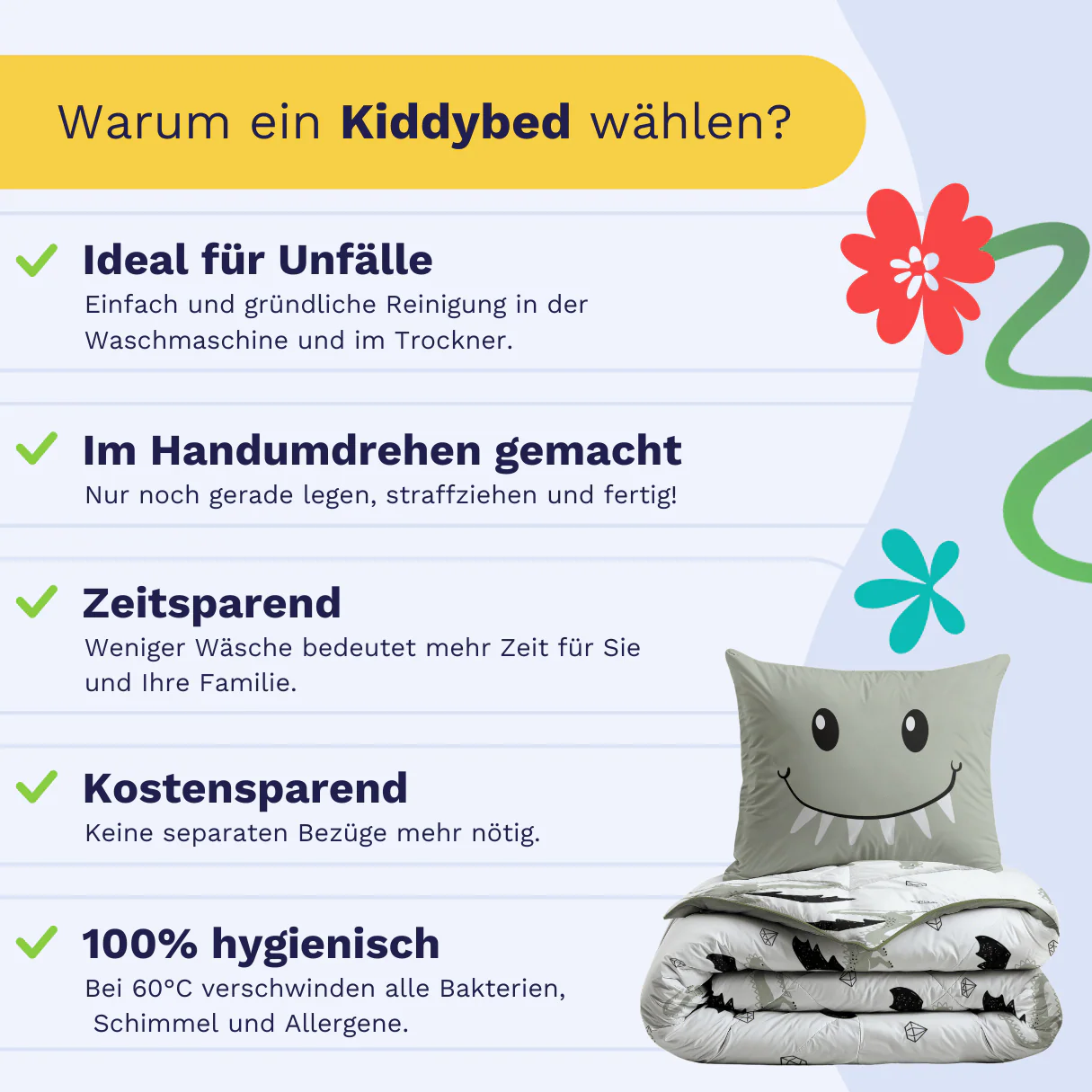 - Schnell sauber: Unfälle passieren, aber mit einem Kiddybed sind sie im Nu behoben. Ab in die Waschmaschine, kurz in den Trockner und wieder aufs Bett!